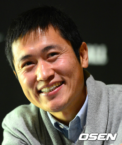 이영표가 취재진의 질문에 환하게 웃고 있다.