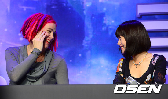 13일 오후 서울 쉐라톤 워커힐 호텔에서 열린 영화 '클라우드 아틀라스' 내한 기자회견에서 앤디 워쇼스키 감독이 배두나와 이야기를 나누고 있다