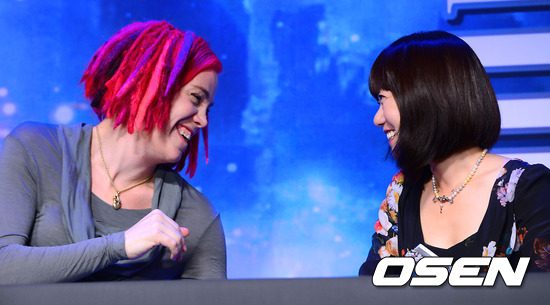 13일 오후 서울 쉐라톤 워커힐 호텔에서 열린 영화 '클라우드 아틀라스' 내한 기자회견에서 라나 워쇼스키 감독과 배두나가 이야기를 나누고 있다
