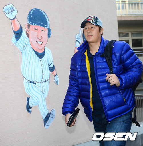 13일 오후 부산 서구 경남고등학교에 도착한 이대호가 훈련을 위해 야구장으로 향하고 있다.