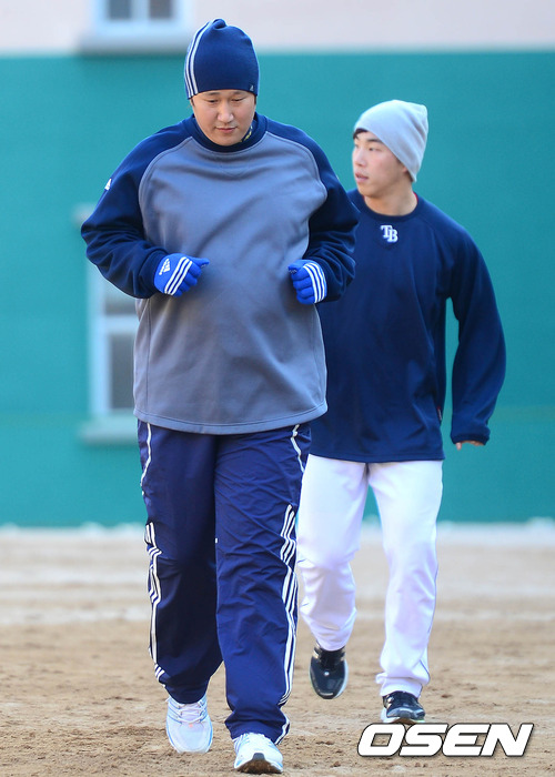 이대호(오릭스)가 13일 오후 부산 서구 경남고등학교에서 강경덕(템파베이)과 런닝을 하며 몸을 풀고 있다.
