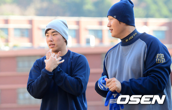 이대호(오릭스)가 13일 오후 부산 서구 경남고등학교에서 강경덕(템파베이)과 몸을 풀고 있다.