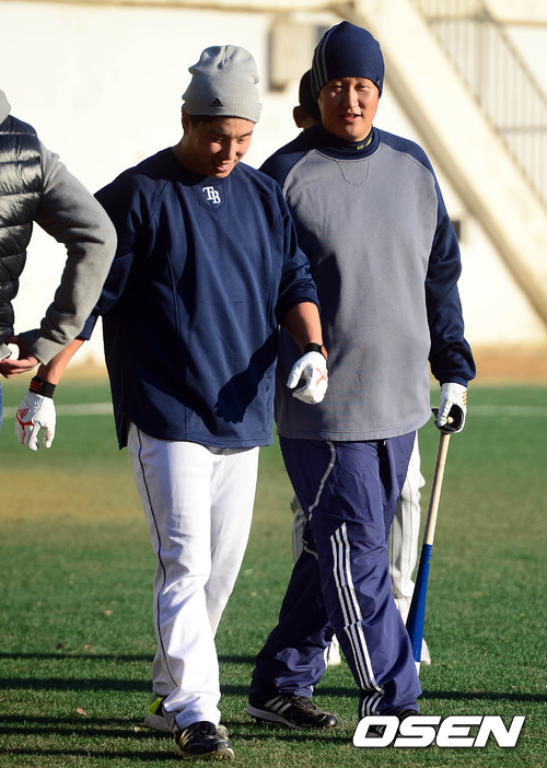 이대호(오릭스)가 13일 오후 부산 서구 경남고등학교에서 강경덕(템파베이)과 훈련 중 이야기를 나누고 있다.