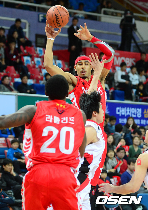 13일 오후 울산 동천체육관에서 열린 'KB 국민카드 2012-2013 프로농구' 울산 모비스와 안양 KGC 인삼공사의 경기 1쿼터 모비스 문태영이 라틀리프에게 패스를 하고 있다.