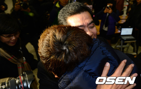 입국장을 나선 류현진이 아버지 류재천씨와 포옹을 하고 있다.