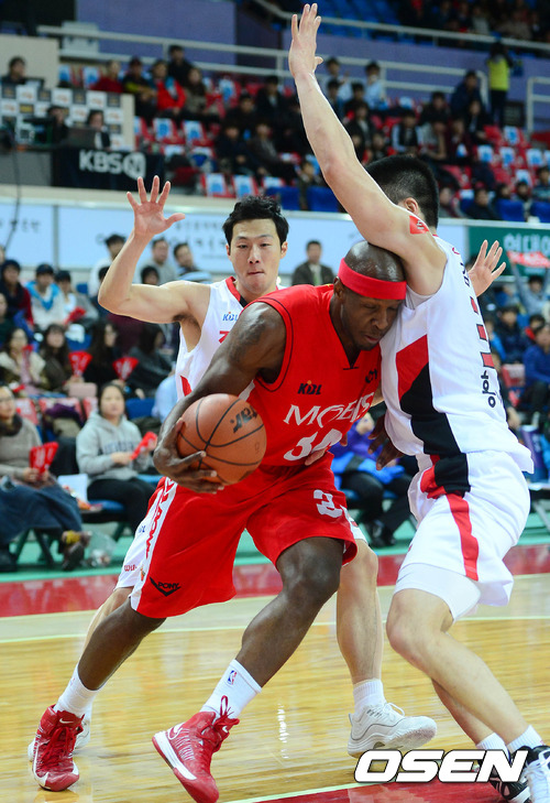 13일 오후 울산 동천체육관에서 열린 'KB 국민카드 2012-2013 프로농구' 울산 모비스와 안양 KGC 인삼공사의 경기 2쿼터 모비스 위더스가 인삼공사 김일두를 앞에 두고 골밑 돌파를 시도하고 있다.