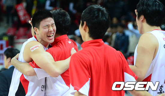 13일 오후 울산 동천체육관에서 열린 'KB 국민카드 2012-2013 프로농구' 울산 모비스와 안양 KGC 인삼공사의 경기 종료 후 김일두가 동료들과 포옹을 하며 승리를 기뻐하고 있다.