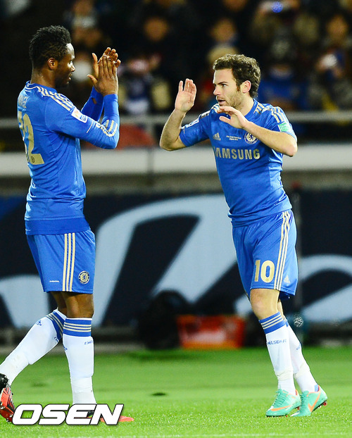첼시의 후안 마타가 선제골을 성공시킨 후 존 오비 미켈과 기쁨을 나누고 있다. / rumi@osen.co.kr