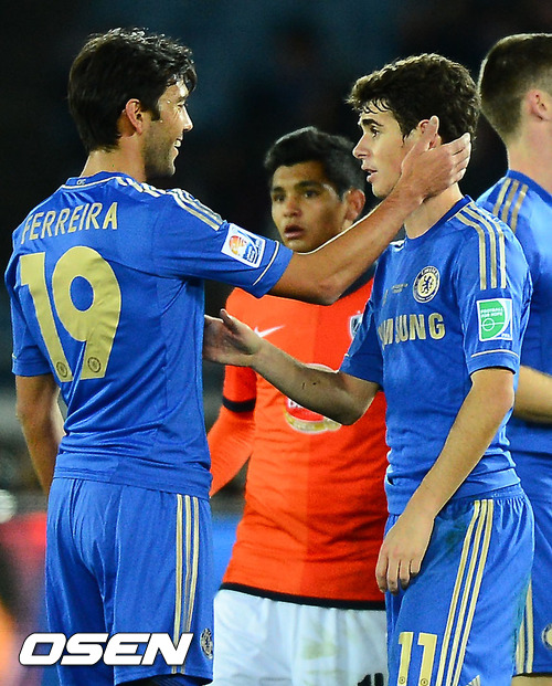경기를 마치고 첼시의 파울루 페헤이라와 오스카르가 승리의 기쁨을 나누고 있다. / rumi@osen.co.kr