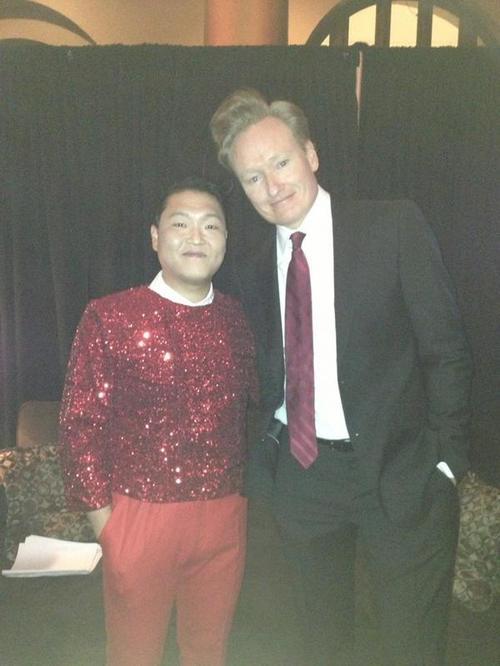 싸이는 14일 오전(한국시간) 자신의 트위터에 “코난 오브라이언과 함께. 키 크고 괜찮은 남자(along with Conan O'Brien. Nice guy and tall)"이라는 글과 함께 한 장의 사진을 게재했다.