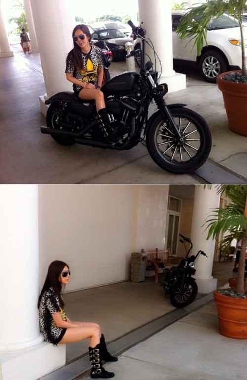 사진 속 한채아는 검정색 부츠와 선글라스를 착용한 채 오토바이위에 앉아 포즈를 취하고 있다. 늘씬한 다리와 긴 생머리가 특유의 섹시한 매력을 돋보이게 하는 모습이다.