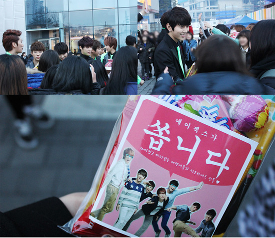 이날 에이젝스는 밖에서 대기 중인 팬들에게 다가가 자신들이 준비한 선물을 직접 나눠주며 인사를 전했다. 이 이벤트는 추운 한파에도 어김없이 방송현장을 찾아주는 팬들에게 특별한 선물을 해주고 싶다는 에이젝스 멤버들의 생각에서 준비된 것이다. 에이젝스는 자신들의 팬은 물론 선배 가수들의 팬들까지 고루고루 챙기며 선물을 전달해 훈훈한 감동을 줬다.