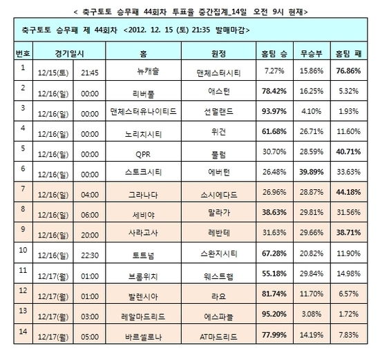 축구토토 승무패 44회차 투표율 중간집계 결과
