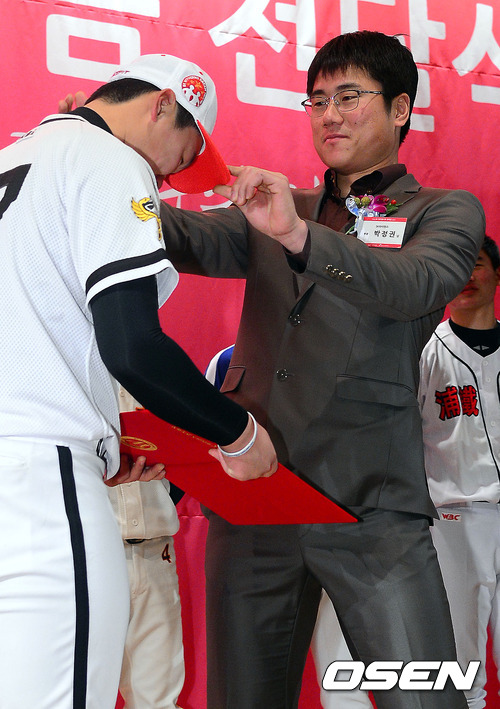 14일 오전 서울 청담동 리베라호텔에서 진행된 '제3회 SK 야구 꿈나무 장학금 전달식'에서 SK 박정권이 이수민(대구 상원고)선수에게 기념 모자를 씌워주고 있다.