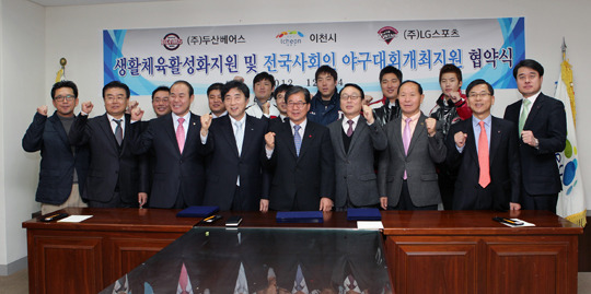 LG 스포츠와 두산 베어스는 14일 이천시청에서 조병돈 이천시장, LG스포츠 전진우 사장, 두산베어스 김승영 사장, LG트윈스 이진영, 임찬규 선수와 두산베어스 김선우, 김현수 선수가 참석한 가운데 이천시 생활체육 활성화 지원과 지역사회 기여내용을 명시한 협약 체결식을 가졌다.