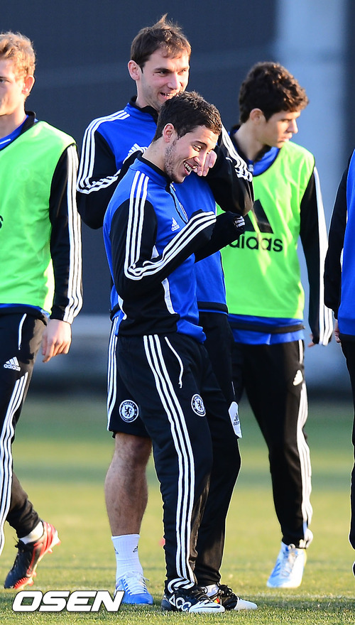 첼시의 에당 아자르와 브라니슬라브 이바노비치가 훈련 중 캥거루 흉내를 내고 있다.