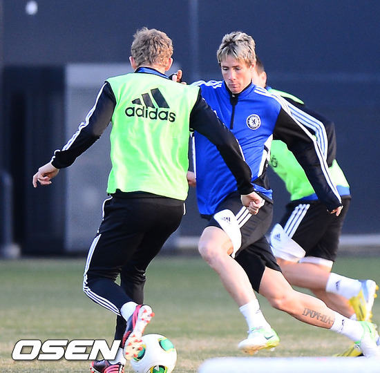 훈련 중 첼시의 페르난도 토레스가 미니게임을 하고 있다.