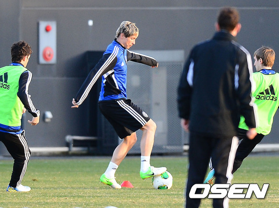 훈련 중 첼시의 페르난도 토레스가 미니게임을 하고 있다.