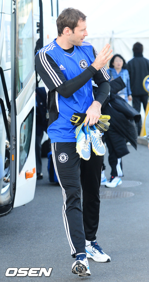첼시의 페트르 체흐가 버스에서 내린 후 팬들에게 손 인사를 하고 있다.