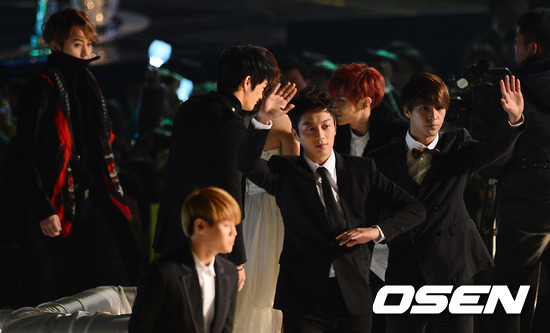 시상식에 앞서 비스트가 입장하며 팬들에게 손을 흔들고 있다.