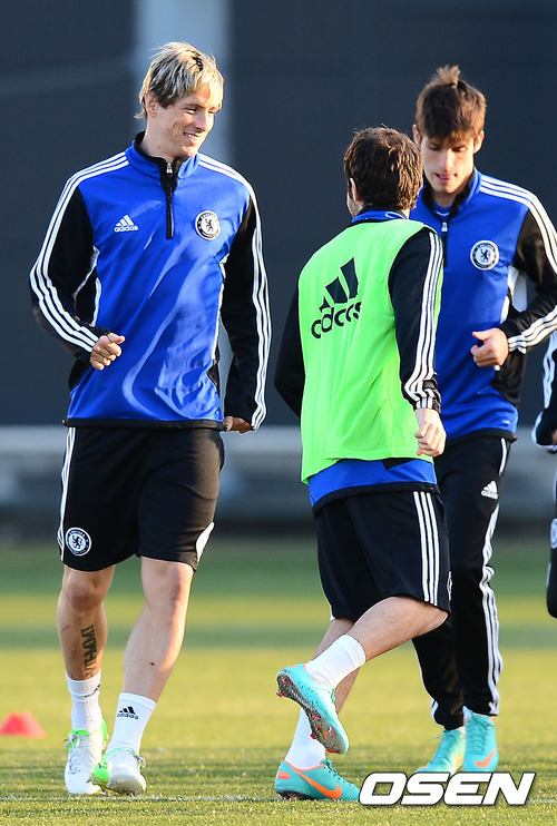 훈련장에서 몸을 풀던 첼시의 페르난도 토레스와 후안 마타가 즐겁게 얘기를 나누고 있다.