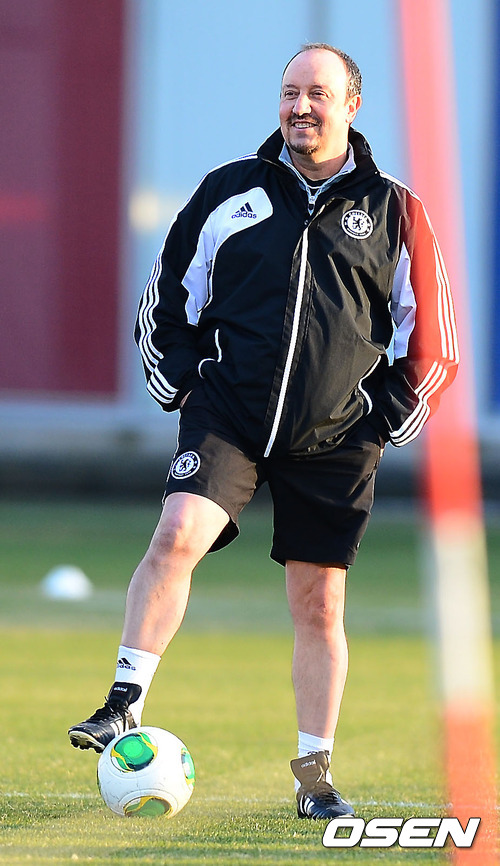 훈련장에서 첼시 베니테스 감독이 선수들의 훈련을 지켜보며 미소짓고 있다.