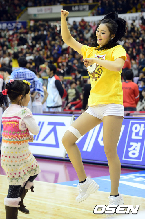 14일 오후 창원 실내체육관에서 열린 'KB 국민카드 2012-2013 프로농구' 창원 LG와 부산 KT의 경기, 치어리더들이 관중들과 댄스 타임을 갖고 있다.