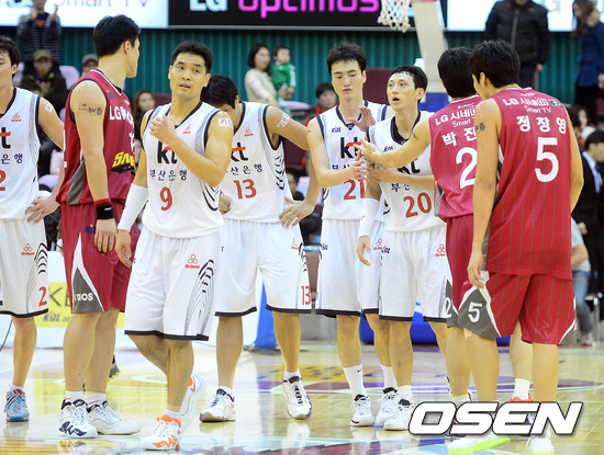 14일 오후 창원 실내체육관에서 열린 'KB 국민카드 2012-2013 프로농구' 창원 LG와 부산 KT의 경기 종료 후 선수들이 인사를 나누고 있다.