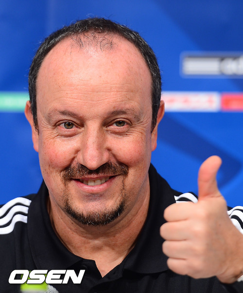 첼시의 라파엘 베니테스 감독이 미소지으며 취재진을 향해 엄지손가락을 치켜올리고 있다.