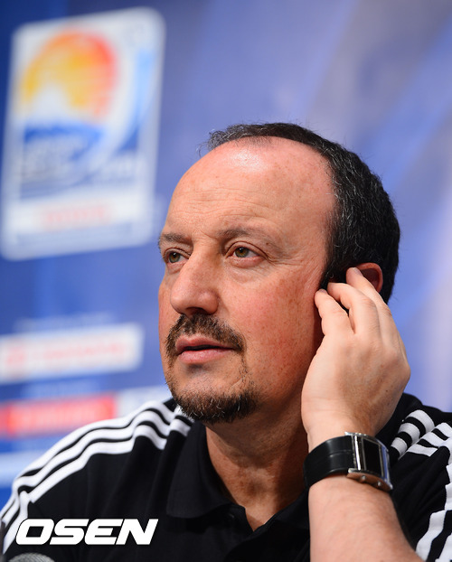 첼시의 라파엘 베니테스 감독이 통역기를 통해 질문을 듣고 있다.