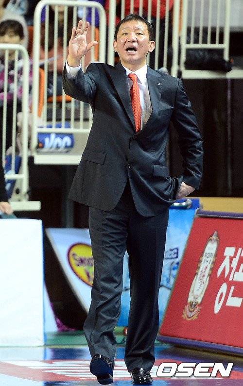 15일 오후 전주 실내체육관에서 열린 'KB 국민카드 2012-2013 프로농구' 전주 KCC와 울산 모비스의 경기 2쿼터 허재 감독이 선수들에게 지시를 하고 있다.