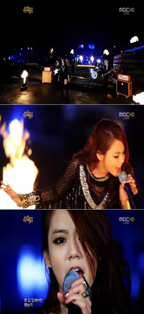 이날 검정색의 반짝이는 의상을 입고 등장한 한승연은 기존의 귀엽고 발랄한 이미지를 탈피, 어둡고 강렬한 느낌의 무대를 선보였다.