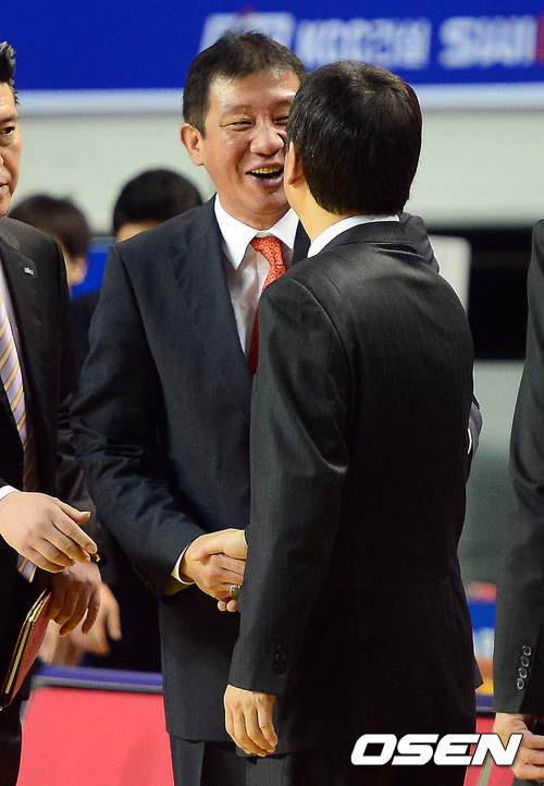 15일 오후 전주 실내체육관에서 열린 'KB 국민카드 2012-2013 프로농구' 전주 KCC와 울산 모비스의 경기 종료 후 허재 감독과 유재학 감독이 인사를 나누고 있다.