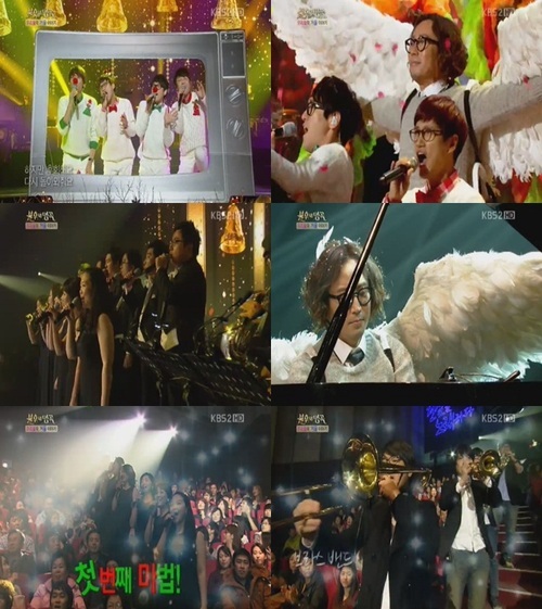하지만 깜찍으로 정리되던 노래 분위기는 후반부에서 객석에 코러스와 브라스밴드가 자리하면서 반전됐다. 이 때 정재형은 대형 천사날개를 달고 등장, 피아노 연주를 하며 감미로운 분위기를 고조시켰다.