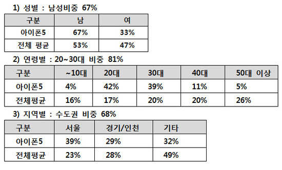 또한, 전체 KT 휴대폰 이용자 중 남성 비중이 53%인데 비해 아이폰5는 남성이 67%에 이르러, 아이폰5가 최신 IT기기를 선호하는 '젊은 남성층'의 사랑을 가장 많이 받고 있는 것으로 분석 됐다.