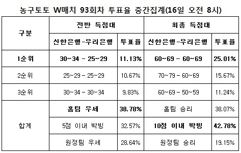 국민체육진흥공단(www.kspo.or.kr)이 발행하는 체육진흥투표권 수탁사업자인 스포츠토토 공식 온라인 발매사이트인 베트맨(www.betman.co.kr)이 오는 17일 오후 7시 안산와동체육관에서 벌어지는 신한은행-우리은행 전 대상 농구토토 W매치 93회차 투표율을 중간 집계한 결과, 전체 참가자의 42.78%는 양 팀의 10점차 이내 박빙승부를 예상했다고 밝혔다.
