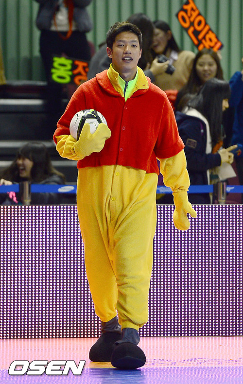 16일 오후 서울 잠실실내체육관에서 열린 '하나은행과 함께하는 Share the Dream Football Match 2012' 경기, 홍정호가 푸 복장을 하고 있다