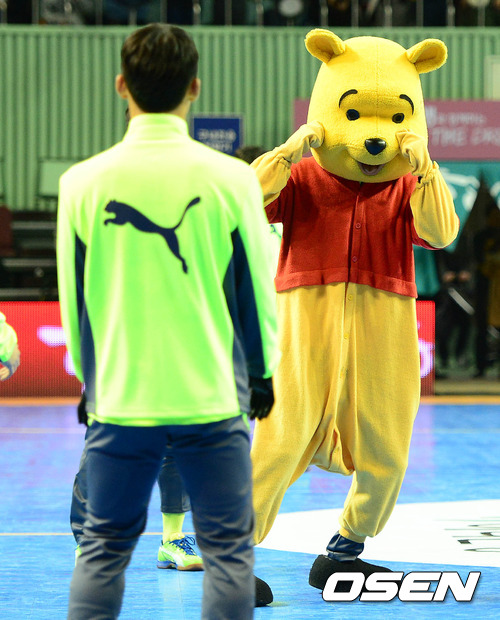 16일 오후 서울 잠실실내체육관에서 열린 '하나은행과 함께하는 Share the Dream Football Match 2012' 경기, 경기에 앞서 곰인형의 탈을 쓴 홍정호가 선수들과 함께 연습 경기를 갖고 있다.