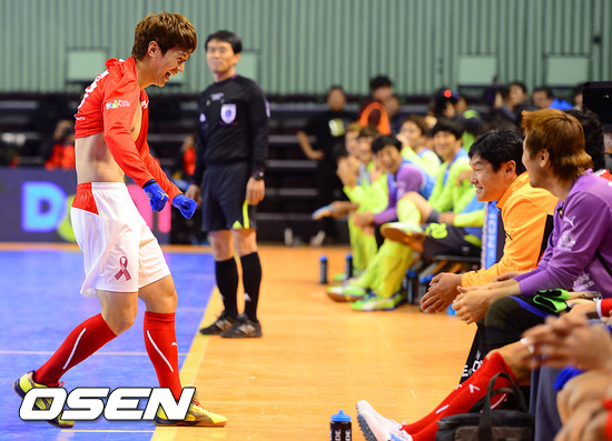 16일 오후 서울 잠실실내체육관에서 열린 '하나은행과 함께하는 Share the Dream Football Match 2012' 경기, 사랑팀 송진형이 선취골 세레모니를 하고 있다