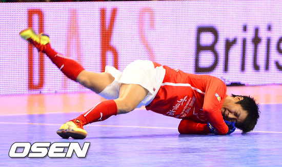 16일 오후 서울 잠실실내체육관에서 열린 '하나은행과 함께하는 Share the Dream Football Match 2012' 경기, 사랑팀 이수근이 할리우드 액션을 하고 있다