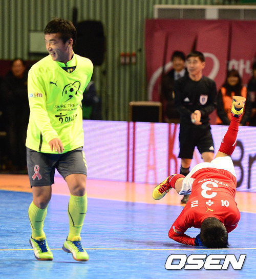 16일 오후 서울 잠실실내체육관에서 열린 '하나은행과 함께하는 Share the Dream Football Match 2012' 경기, 전반 사랑팀 이수근이 넘어지고 있다.