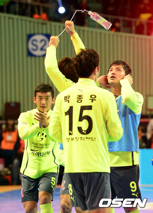 16일 오후 서울 잠실실내체육관에서 열린 '하나은행과 함께하는 Share the Dream Football Match 2012' 경기, 전반 희망팀의 골때 가수 구자명이 세리머니를 펼치고 있다.