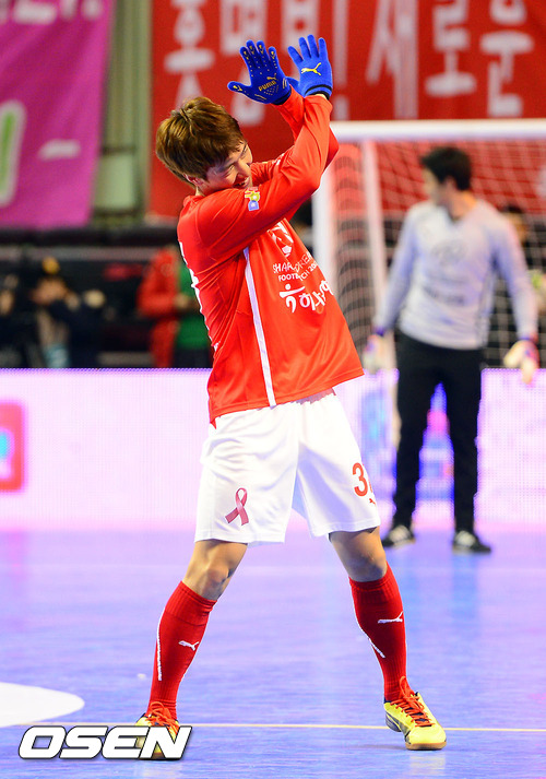 16일 오후 서울 잠실실내체육관에서 열린 '하나은행과 함께하는 Share the Dream Football Match 2012' 경기, 전반 해트티릭을 기록한 사랑팀 송진형이 세레모니 요청을 거부하고 있다