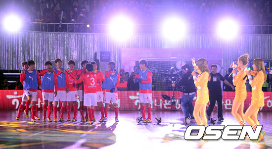 16일 오후 서울 잠실실내체육관에서 열린 '하나은행과 함께하는 Share the Dream Football Match 2012' 경기, 하프타임 사랑팀 선수들이 그룹 오렌지캬라멜의 축하무대때 코트로 나와 춤을 추고 있다.