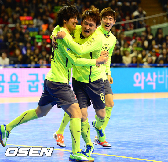 16일 오후 서울 잠실실내체육관에서 열린 '하나은행과 함께하는 Share the Dream Football Match 2012' 경기,후반 서경석이 골을 넣고 환호하고 있다