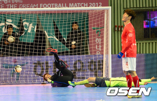 16일 오후 서울 잠실실내체육관에서 열린 '하나은행과 함께하는 Share the Dream Football Match 2012' 경기, 후반 사랑팀 김병지가 골을 허용하고 있다.
