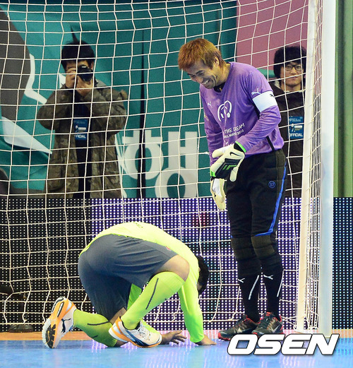 16일 오후 서울 잠실실내체육관에서 열린 '하나은행과 함께하는 Share the Dream Football Match 2012' 경기, 후반 골을 성공시킨 희망팀 구자명이 사랑팀 김병지에게 큰절을 하고 있다.