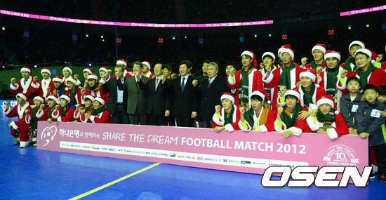 31명의 산타가 축구로 희망을 전했다. 16일 서울 잠실실내체육관에서 열린 '하나은행과 함께 하는 Share the Dream Football Match 2012'서 축구로 사랑과 희망을 전했다.
