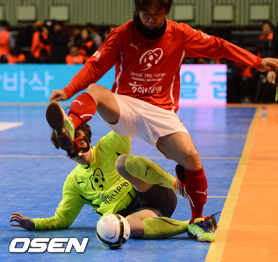 16일 오후 서울 잠실실내체육관에서 열린 '하나은행과 함께하는 Share the Dream Football Match 2012' 선수팀과 코치팀의 경기 전반 오재석이 김태영 코치를 향해 태클하고 있다