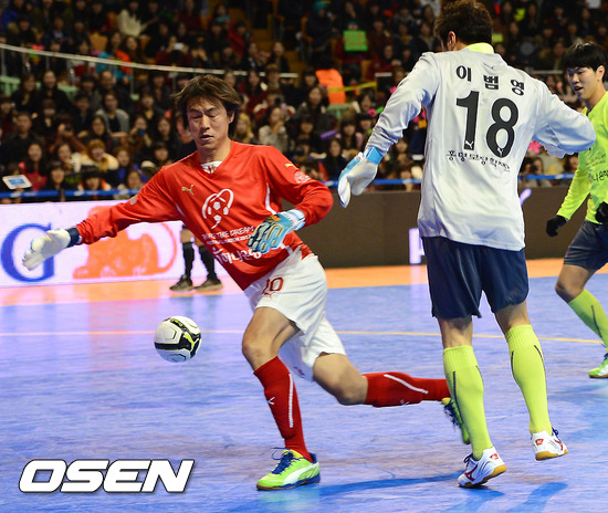 16일 오후 서울 잠실실내체육관에서 열린 '하나은행과 함께하는 Share the Dream Football Match 2012' 선수팀과 코치팀의 경기 전반 홍명보 올림픽대표팀 감독이 이범영의 슛을 막고 있다